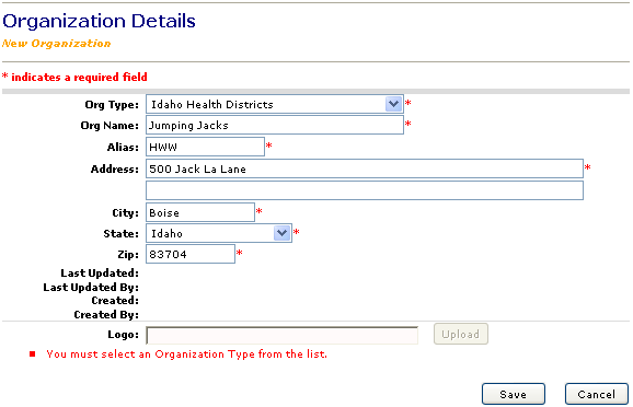 Click the Org Type box and select the type of organization you want to add: either "State of Idaho Department of Health and Welfare" or "Idaho Health Districts".